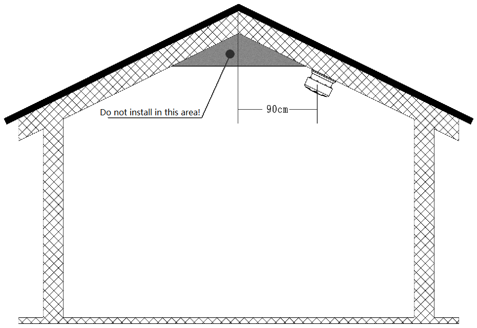 Si vous installez l'alarme de fumée sur le plafond en pente ou pointu, la position d'installation doit être d'au moins 90 cm du point culminant.